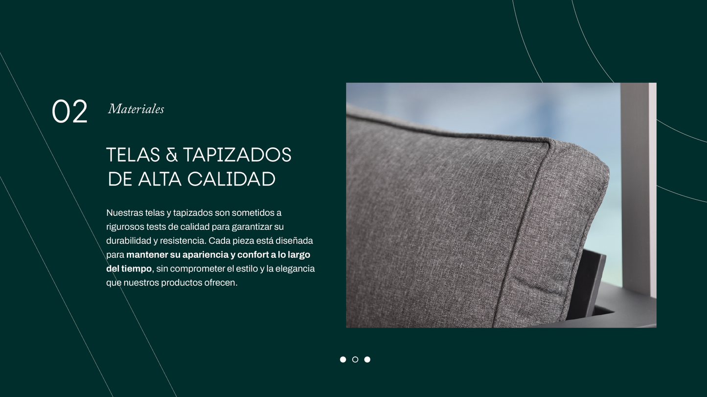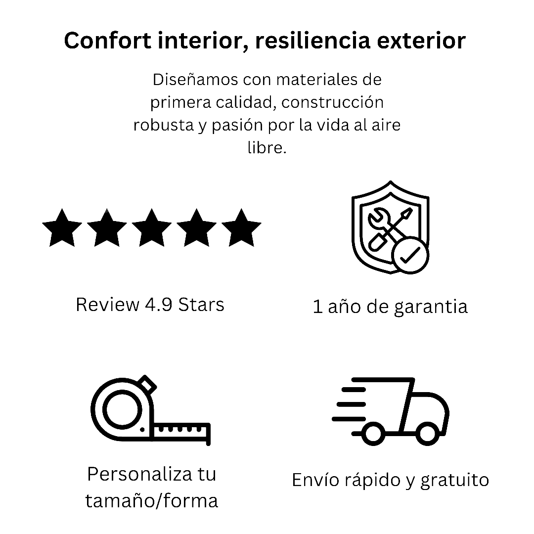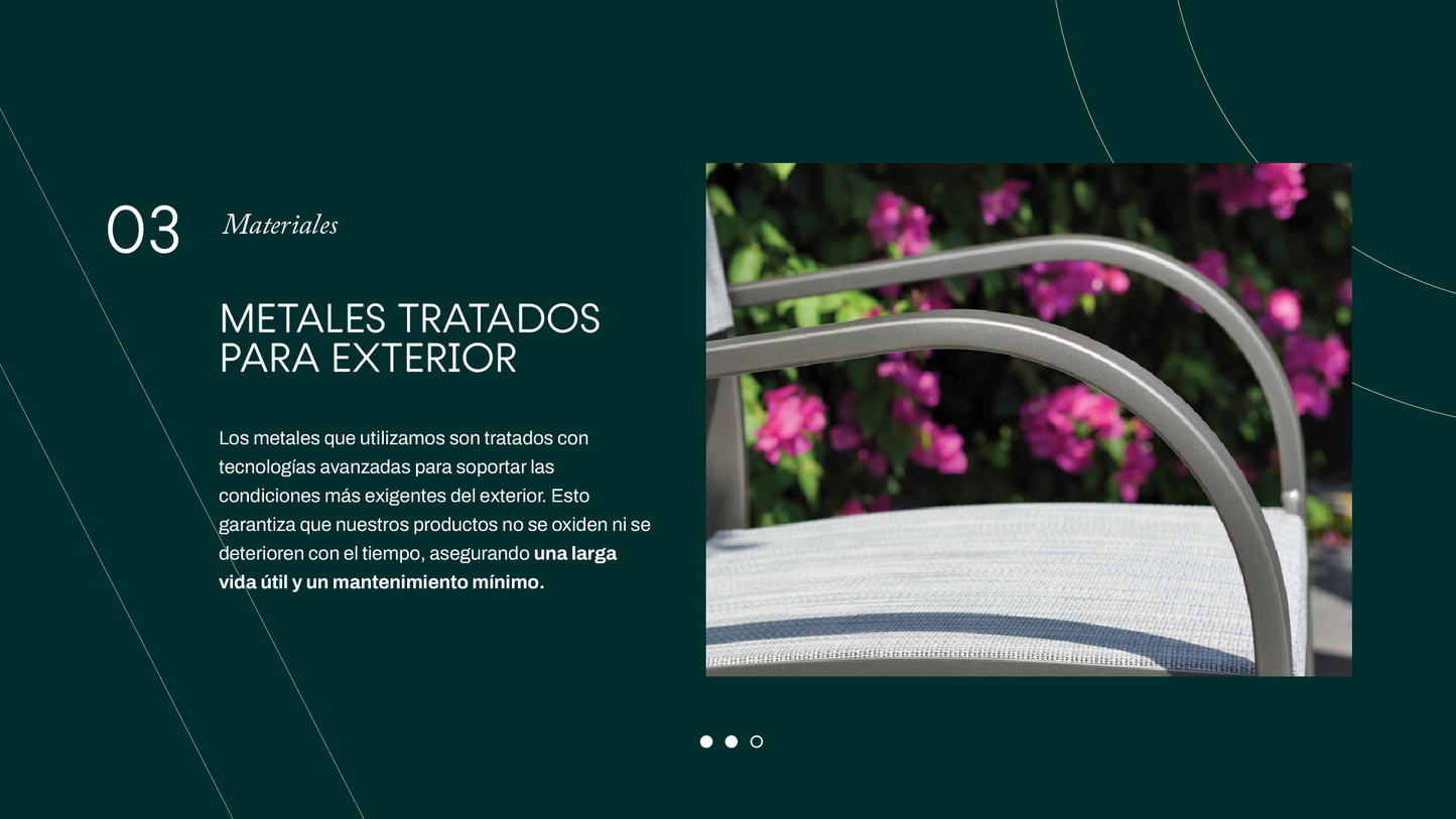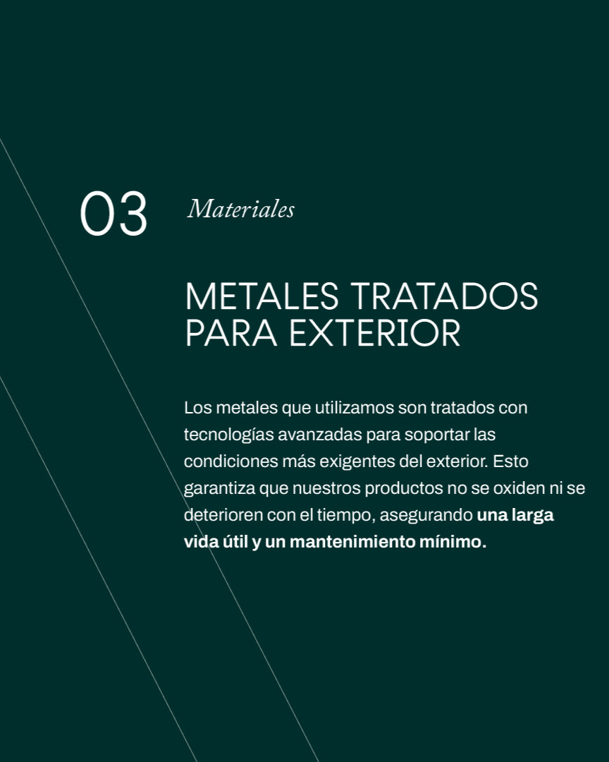 Durabilidad Los productos de exterior de Midtown Concept están construidos para resistir condiciones climáticas adversas, incluyendo el sol intenso, la lluvia y la humedad. Los materiales seleccionados son resistentes a la corrosión, estabilizados contra los rayos UV para evitar el desvanecimiento, y fáciles de limpiar y mantener. Esto garantiza que los muebles conserven su apariencia y funcionalidad durante muchos años, convirtiéndolos en una inversión duradera para cualquier espacio interior o exterior.